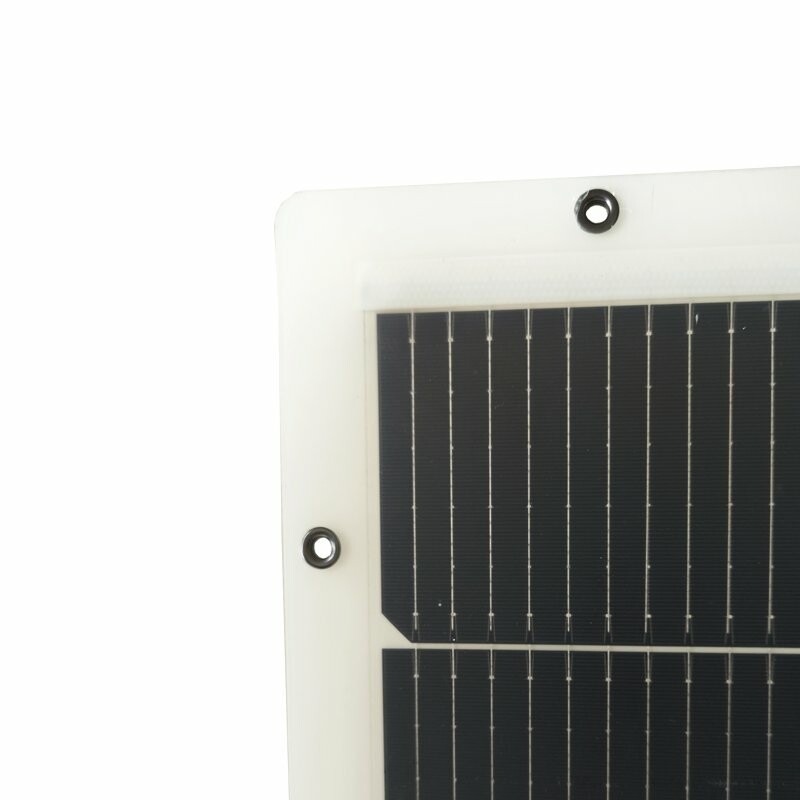 Het paneel beschikt over rondom geperforeerde montagegaten, waardoor het eenvoudig mechanisch kan worden vastgezet wanneer verlijmen niet mogelijk of gewenst is. Hierdoor kan het probleemloos worden bevestigd met schroeven, tyraps of touw. Dit maakt het paneel geschikt voor uiteenlopende situaties, zoals voertuigdaken, boten, campers en mobiele toepassingen.
