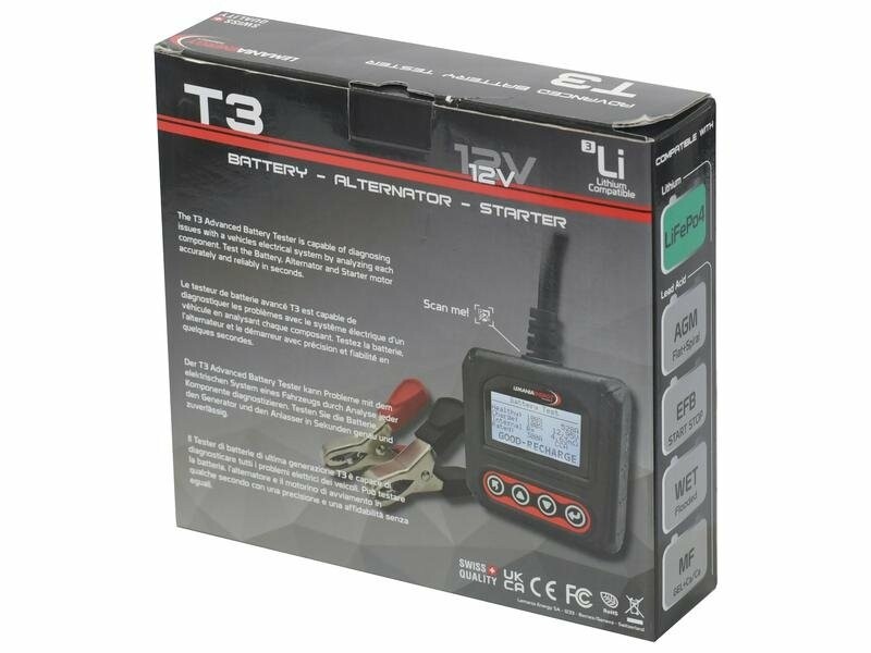 De T3 Tester bevat: De Lemania T3 Professional Accutester maakt gebruik van geavanceerde testtechnologie om snel en eenvoudig het startvermogen en de conditie van voertuigaccu’s te meten, evenals de start- en laadsystemen. De tester kan bovendien defecte cellen detecteren in alle typen startaccu’s, waaronder: